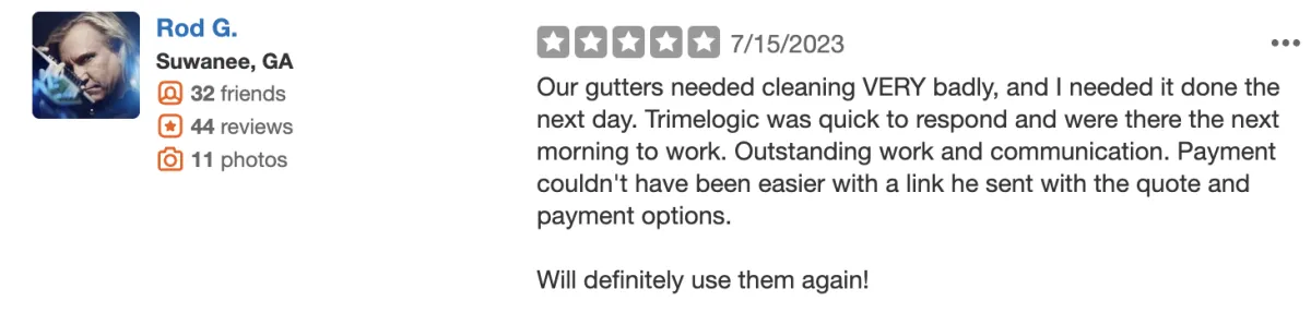 Rock solid job cleaning the gutters. They came out on a cold day and cleaned out very leaf-clogged gutters. Couldn't have been any nicer or quicker. Strongly recommend!!